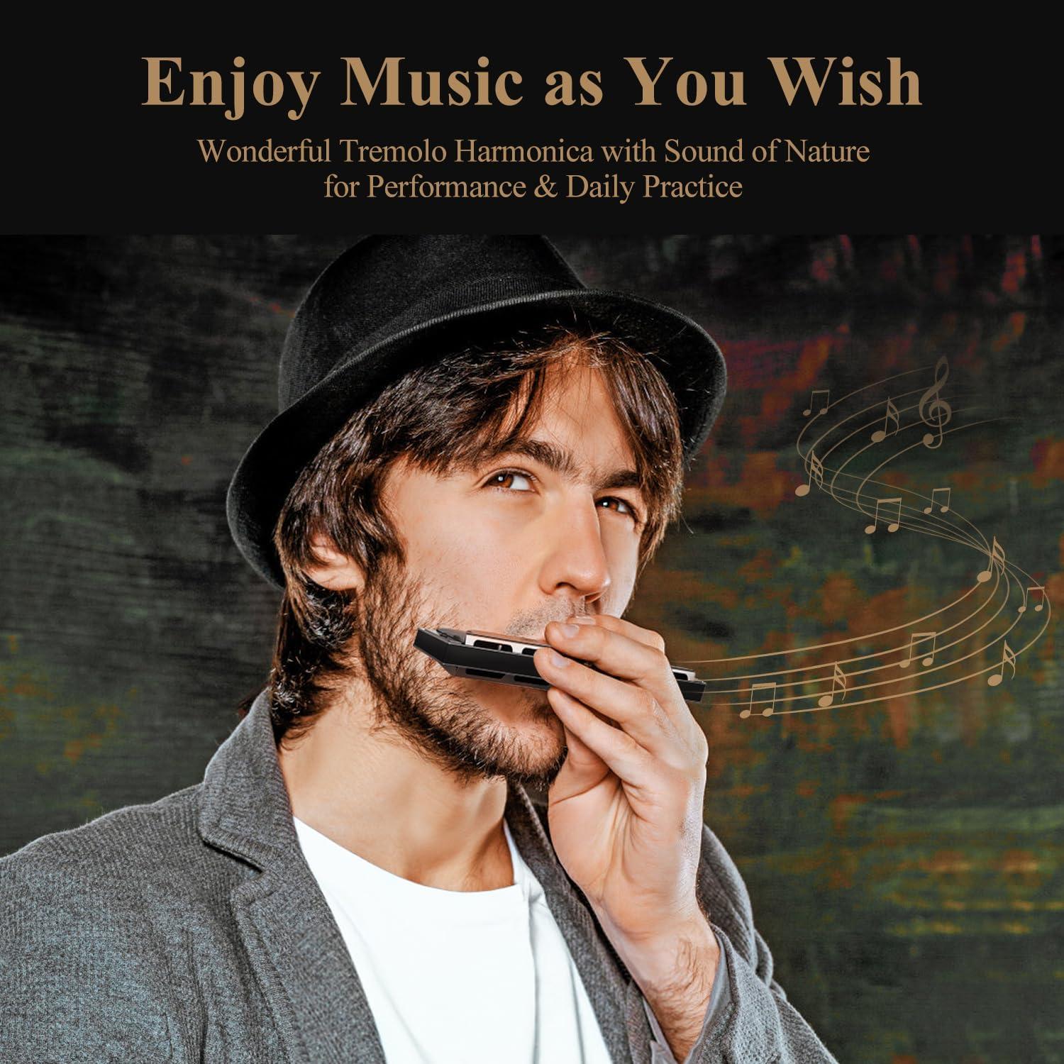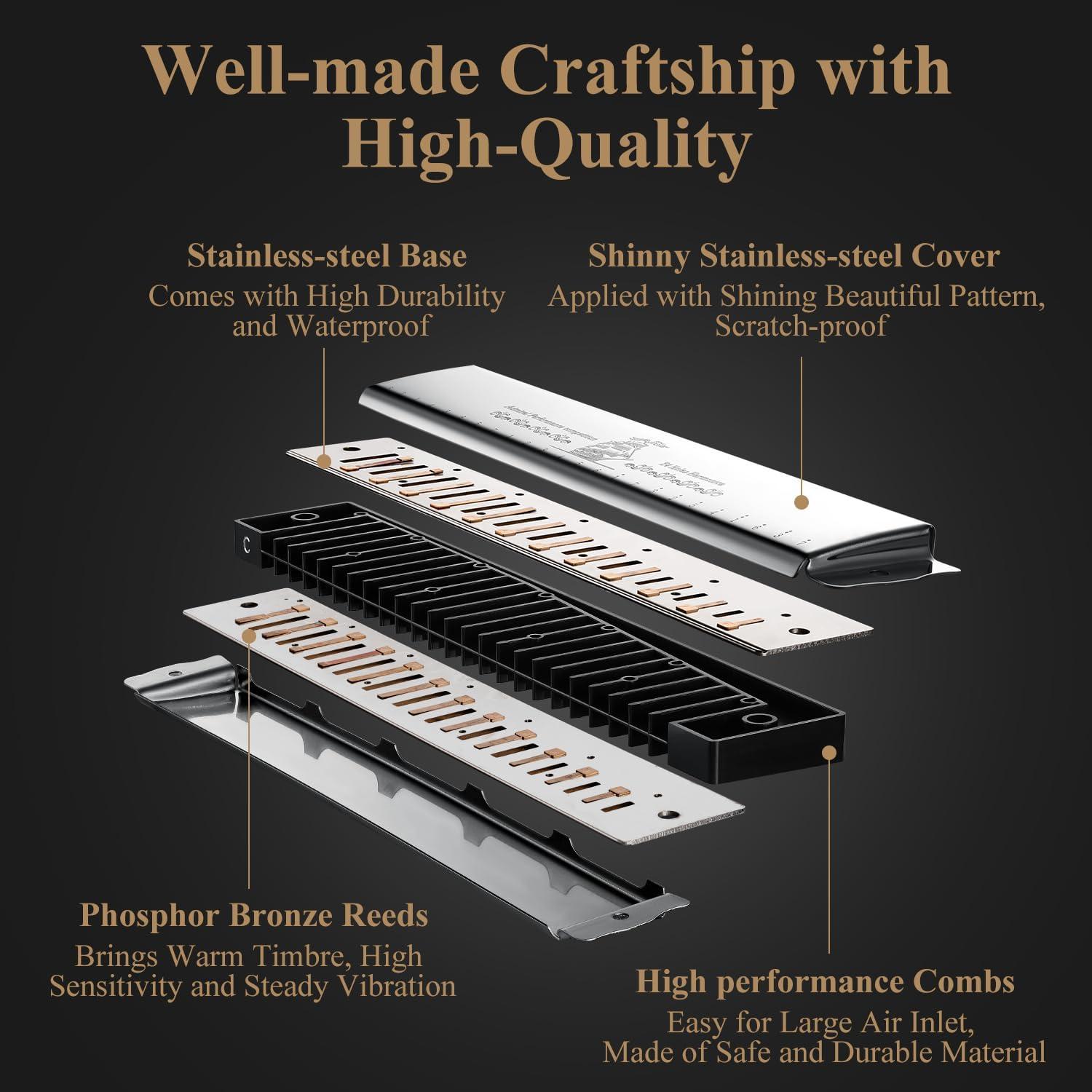 ♫🎁 ADVANCED MATERIAL – Equipped with phosphor bronze reeds, the harmonica provides high sensitivity, and strong explosive force. The thickened brass base (1.1mm) is durable. The non-toxic ABS combs are waterproof and high in hardness.