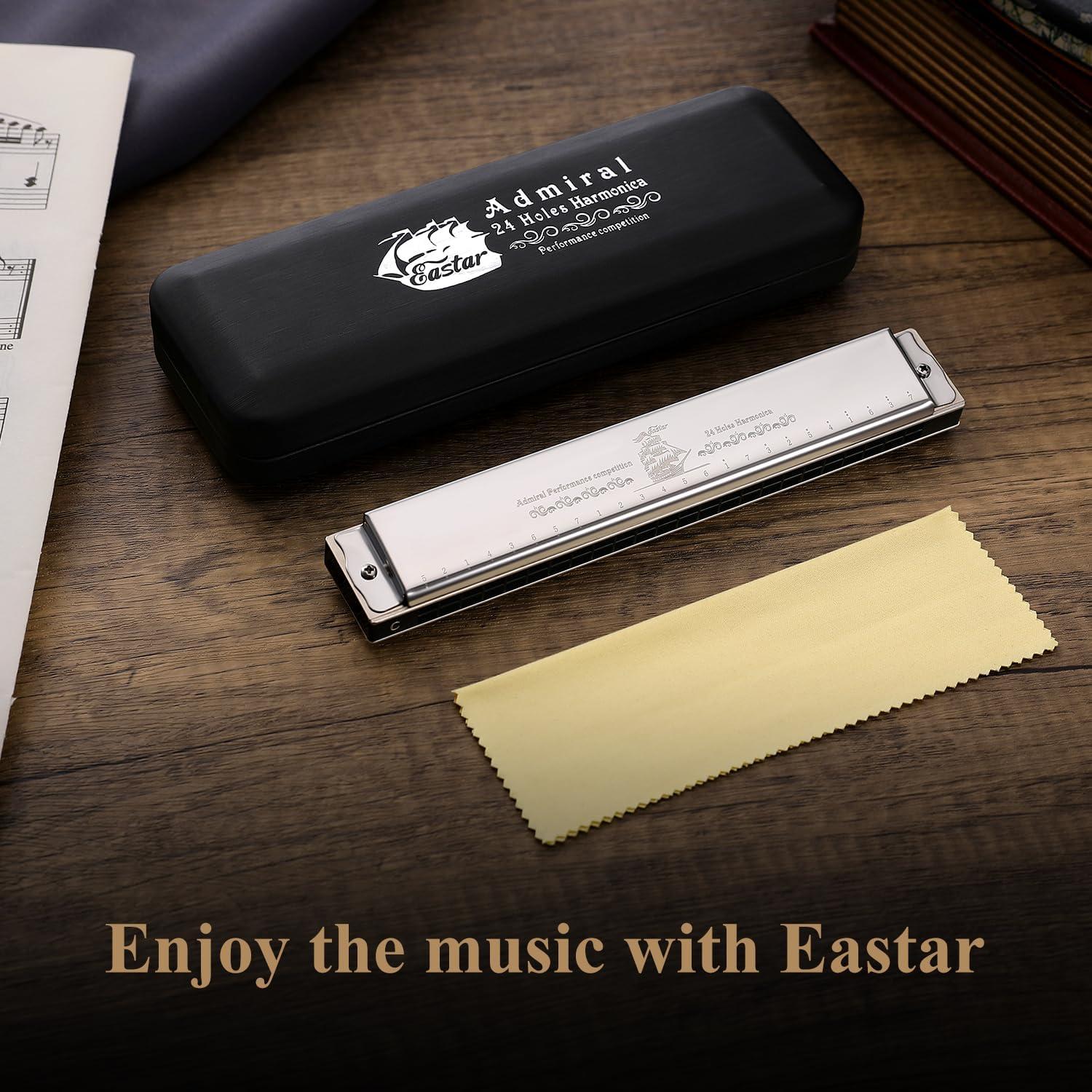 Eastar Admiral 24 Holes Harmonica, Key of C Tremolo for Beginners Adults Kids, Performance Competition Mouth Organ with Hard Case and Cloth, Silver(Silver)