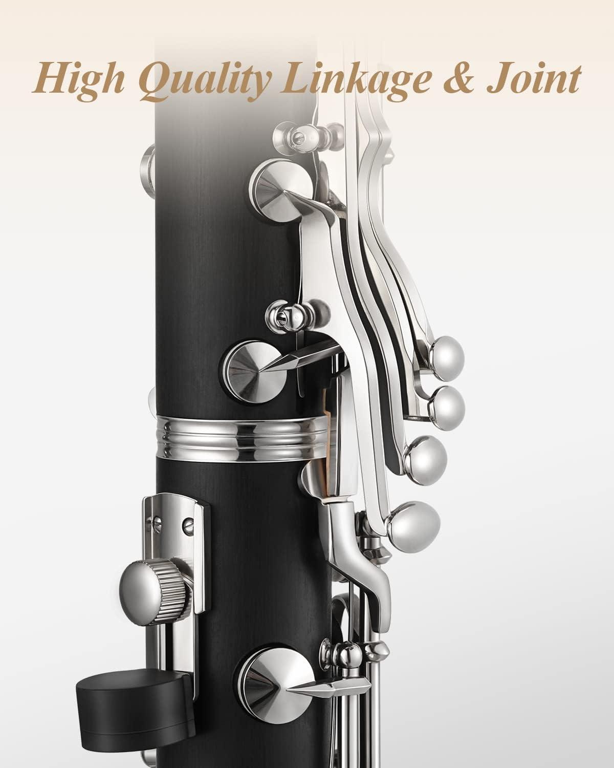 ❤️Wonderful Design – The sleek and sophisticated nickel-plated keys and bakelite body of the clarinet give it an attractive and elegant appearance. The ring-wrapped bell mouth adds a touch of durability to its already impressive design.