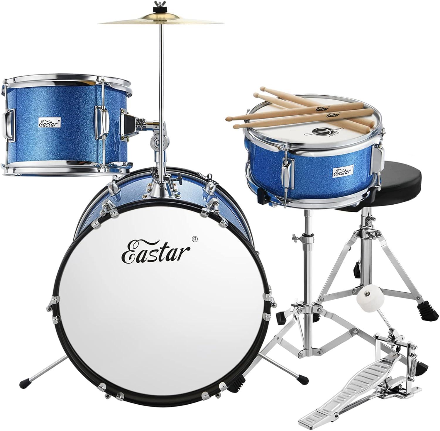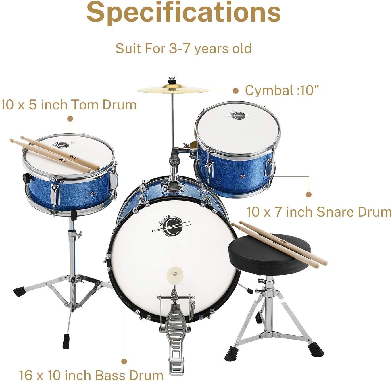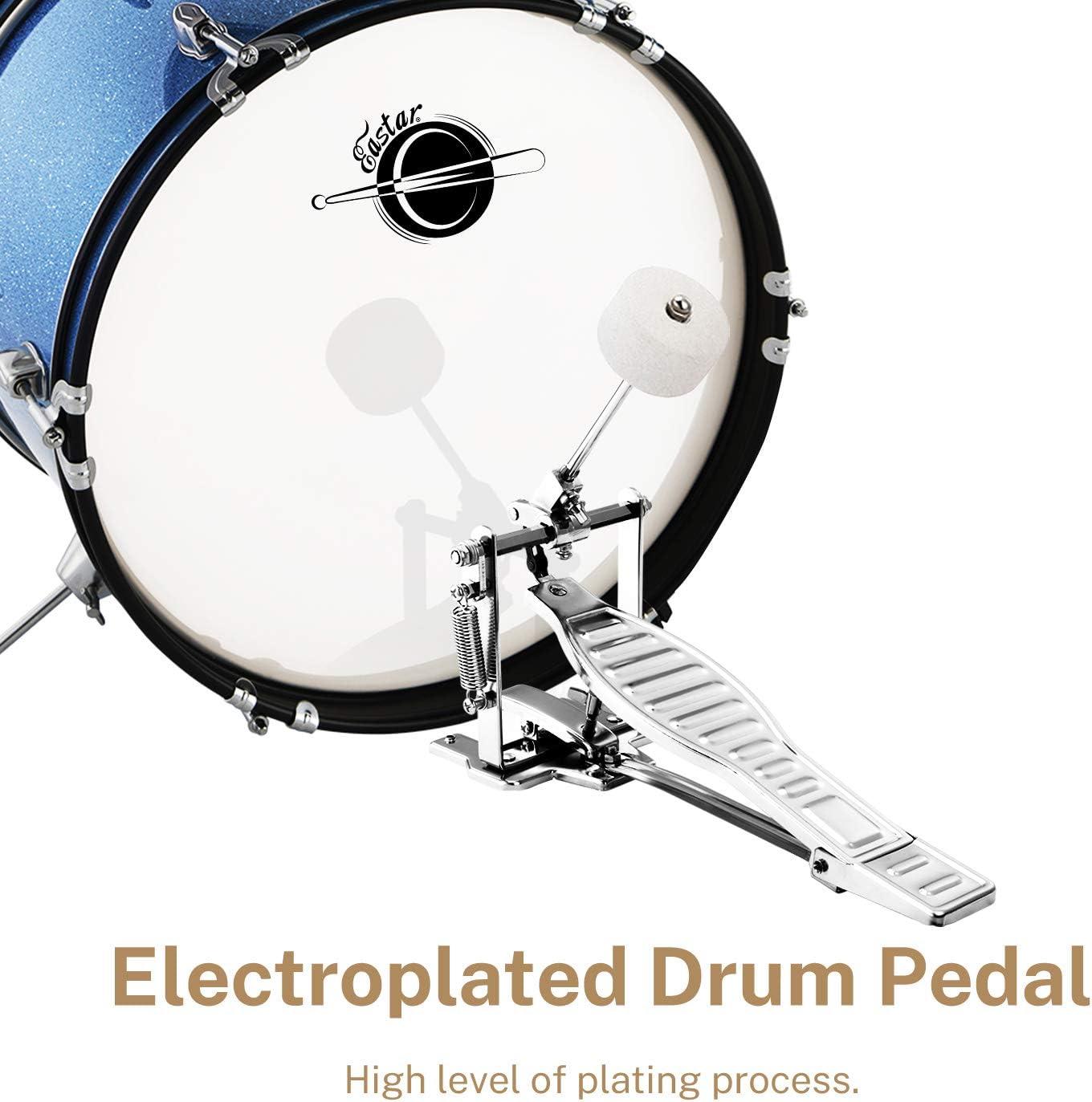 Eastar Kids Drum Set 16 inch 3-Piece, Junior Drum Set Kit with Throne, Cymbal, Pedal & Drumsticks,Metallic Blue (EDS-280Bu)