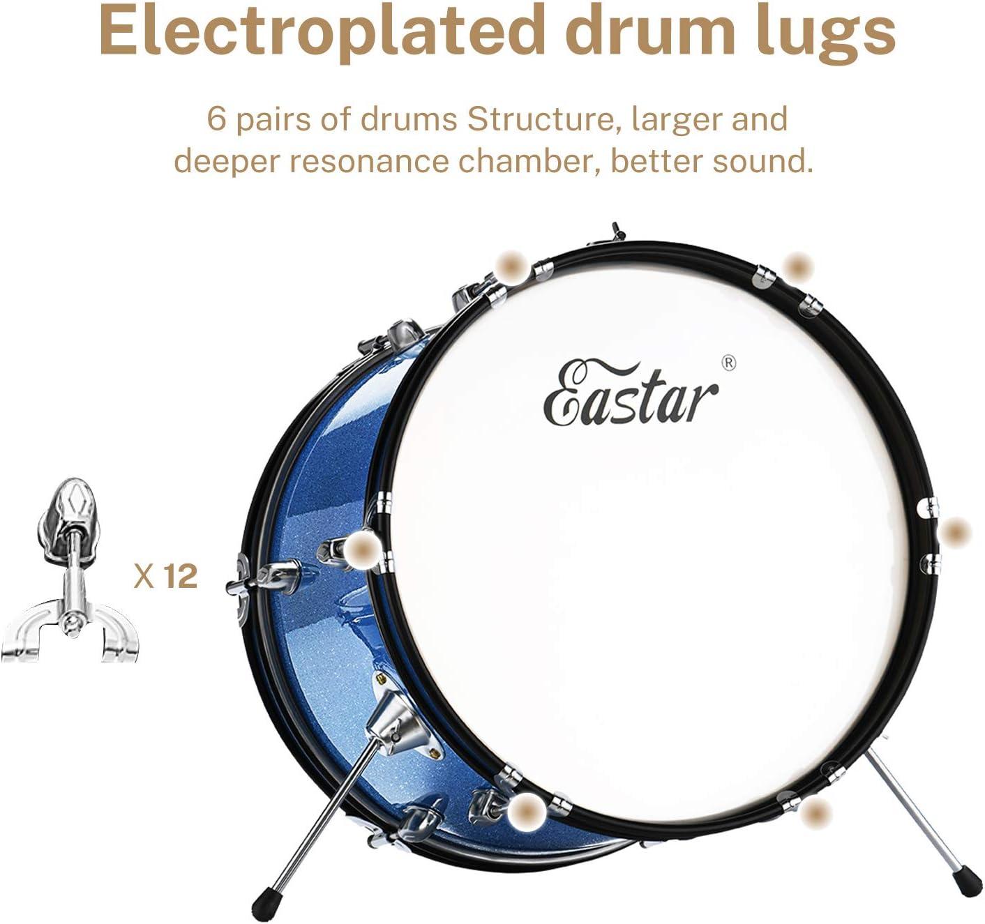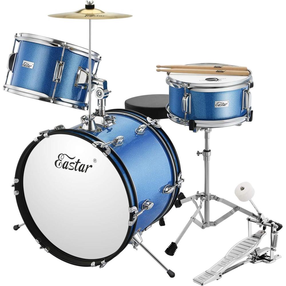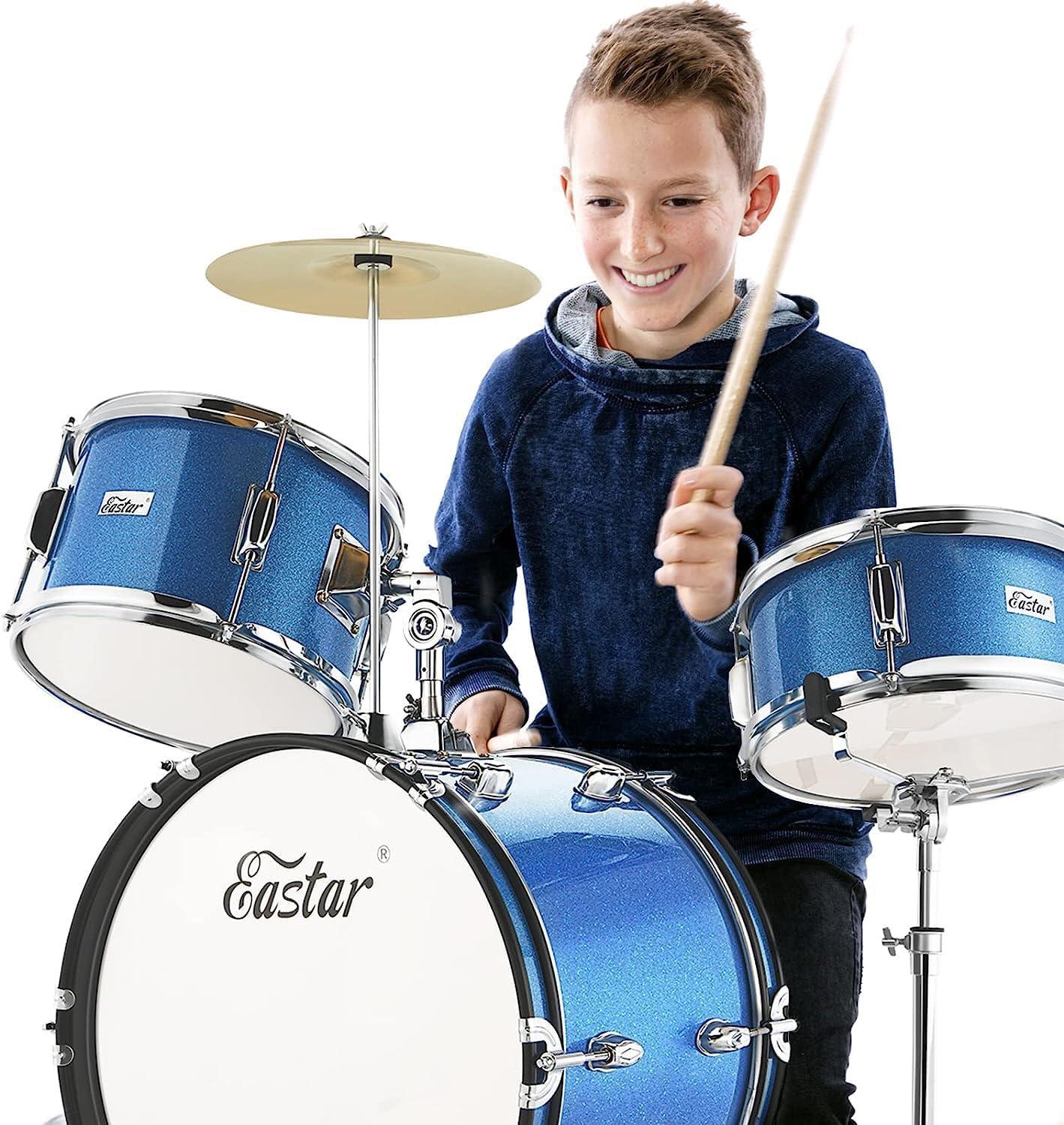 Eastar Kids Drum Set 16 inch 3-Piece, Junior Drum Set Kit with Throne, Cymbal, Pedal & Drumsticks,Metallic Blue (EDS-280Bu)