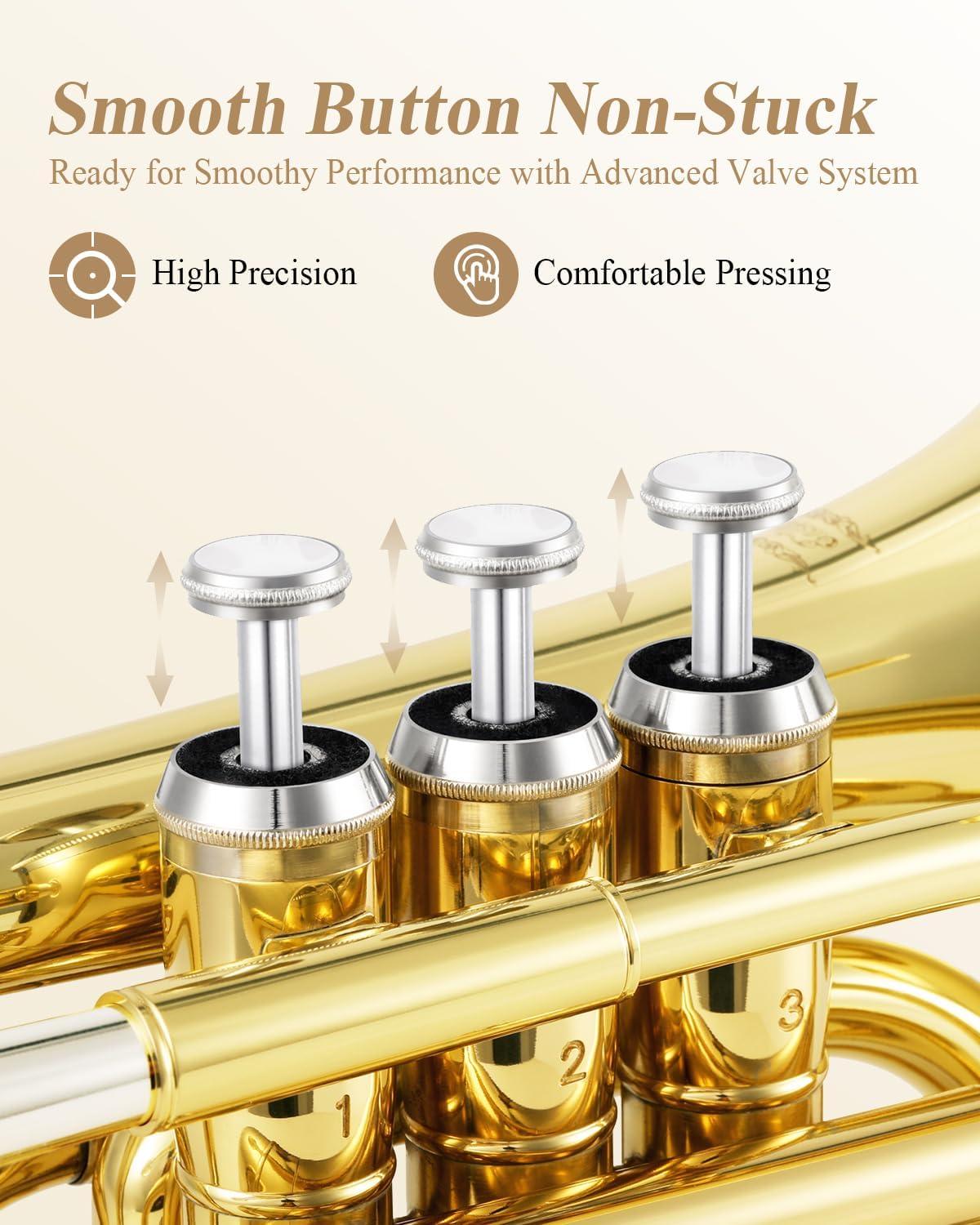 🎺RELIABLE DESIGN — Equipped with a unique about 11.6mm/0.457'' bore and 101mm/3.98'' bell, the trumpet valve system is highly durable during performance without worrying about getting stuck.