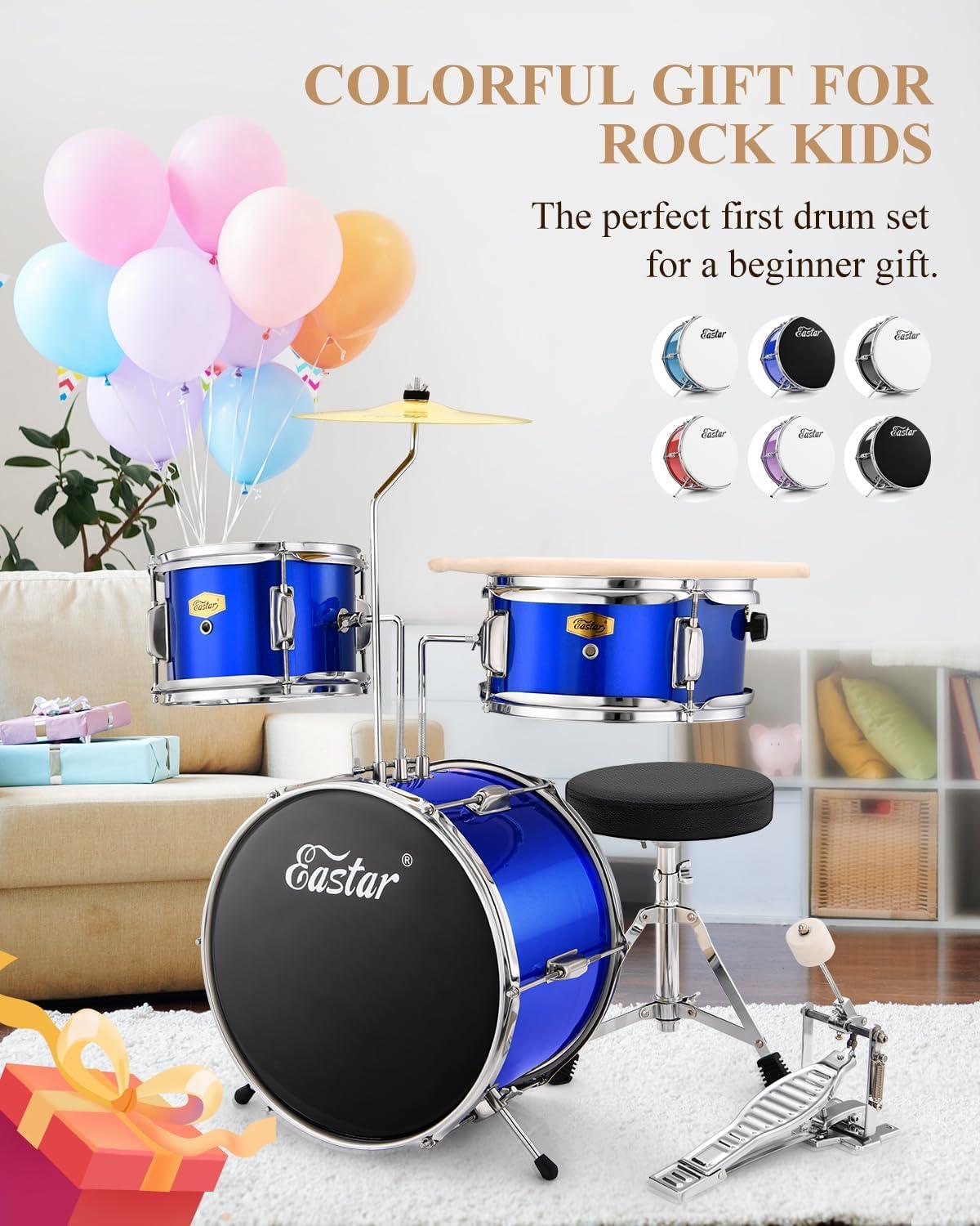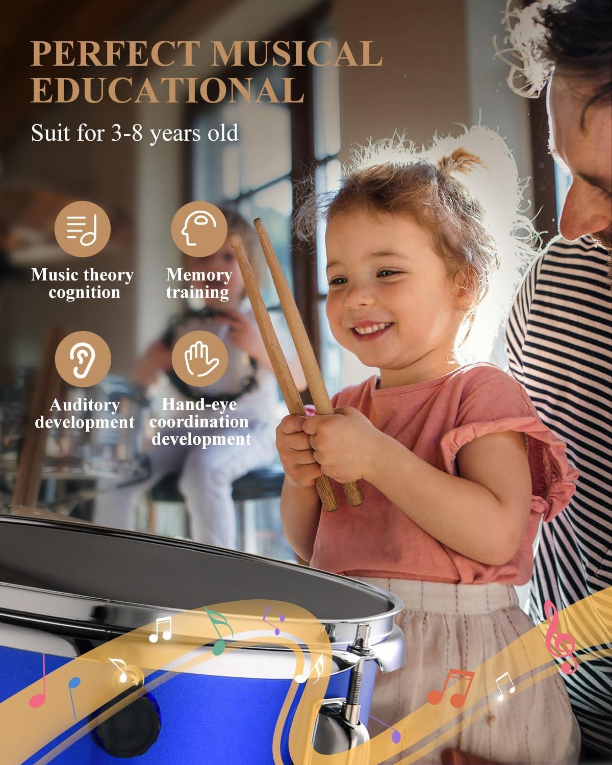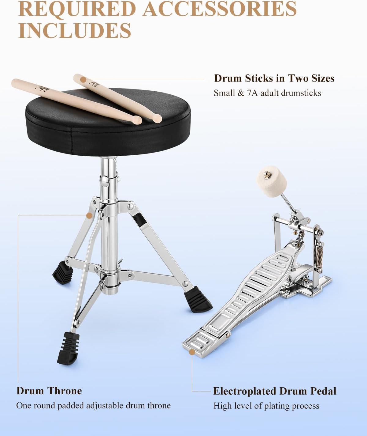 ACCESSORIES: To help kids adapt to learning drum in the early stage, the drums set comes with one plating bass drum pedal, one round padded adjustable drum throne, two small wooden drumsticks and two 7A adults wooden drumsticks
