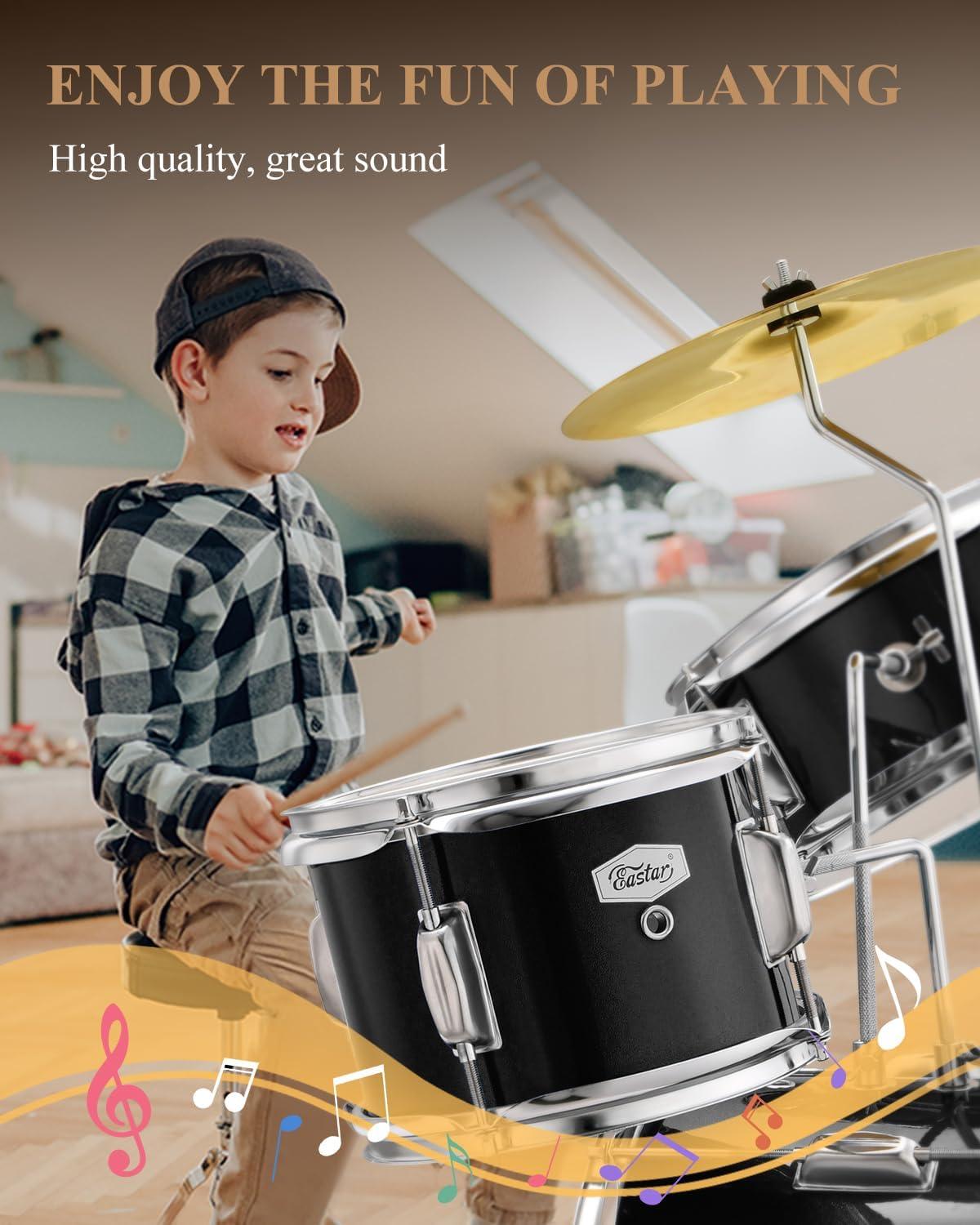 KIDS DRUM KIT: Eastar 3-piece drum set is perfect as beginners in learning and practicing drum, including a 14″ x 10″ Bass drum, a 8″ x 6″ mounted tom drum, a 10″ x 5″ mounted snare drum with internal adjustable soundbelt, and a 10″ cymbal with cymbal arm, providing everything required to get a great start for aged 3-6 7-10.