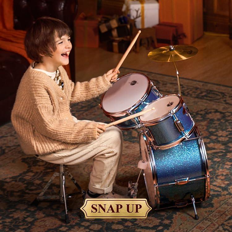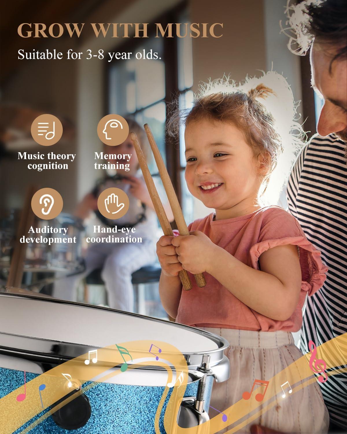 🔷COMPLETE ACCESSORIES : To help kids adapt to learning drum in the early stage, the drums set comes with one plating bass drum pedal. Besides, it also includes a round padded adjustable drum throne, a pair of kids wooden drumsticks and a pair of 7A adults wooden drumsticks, convenient for parents, teachers, elders and children to interact together.