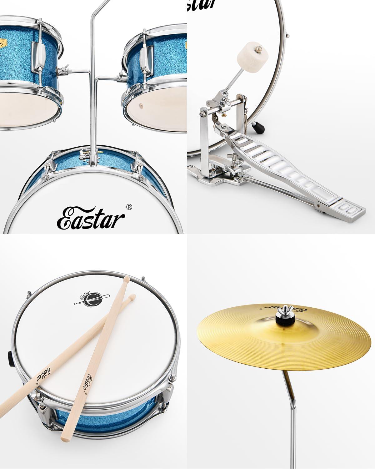 Kids Drum Set Eastar 3-Piece for Beginners, 14 inch Drum Kit with Adjustable Throne, Cymbal, Pedal & Two Pairs of Drumsticks, Junior Drum Set with Bass Tom Snare Drum, Metallic Sky Blue(Blue)