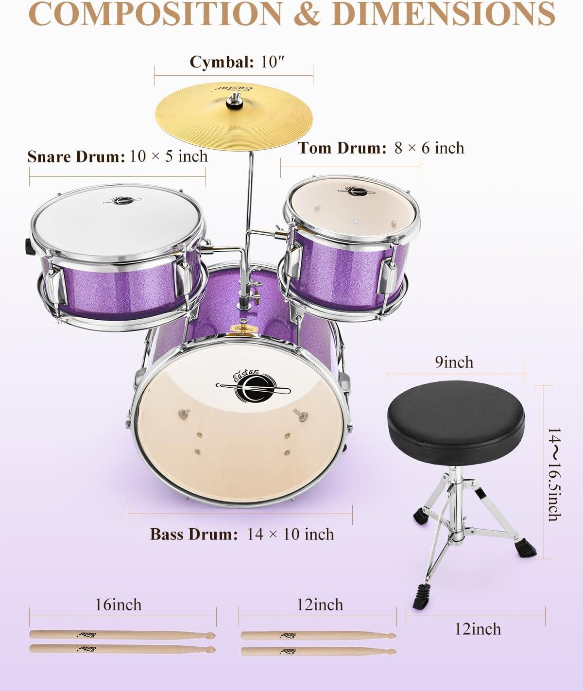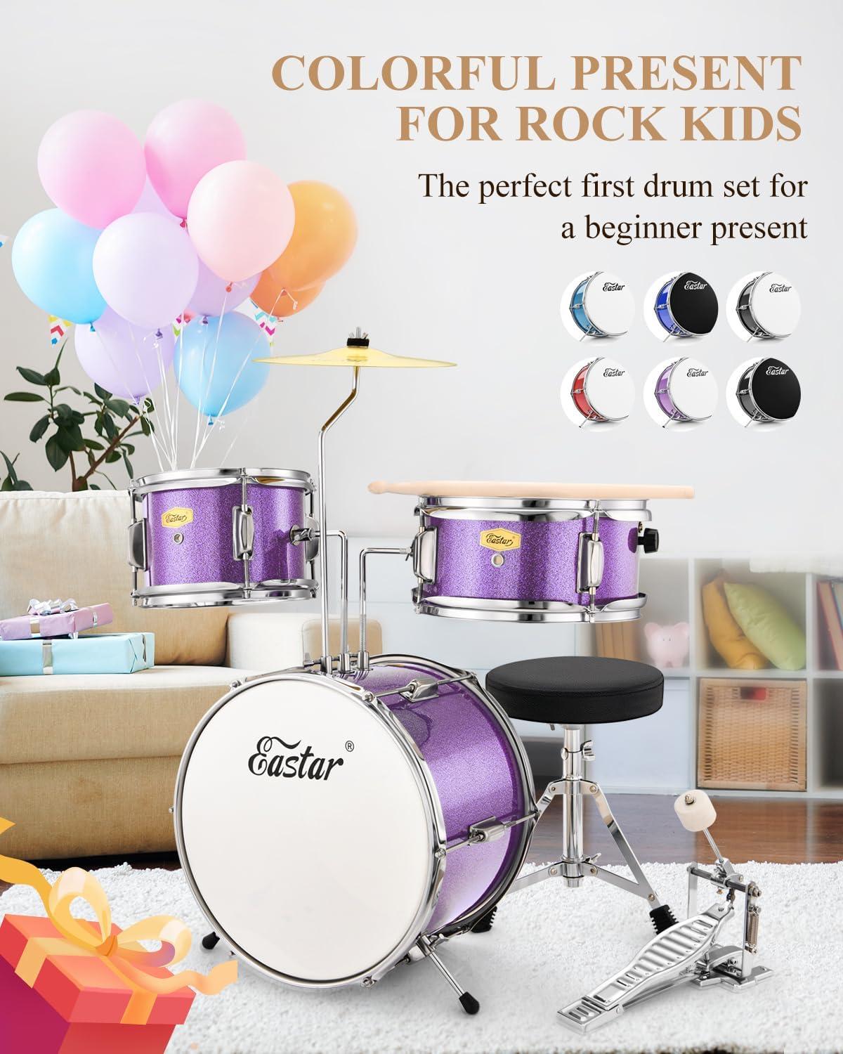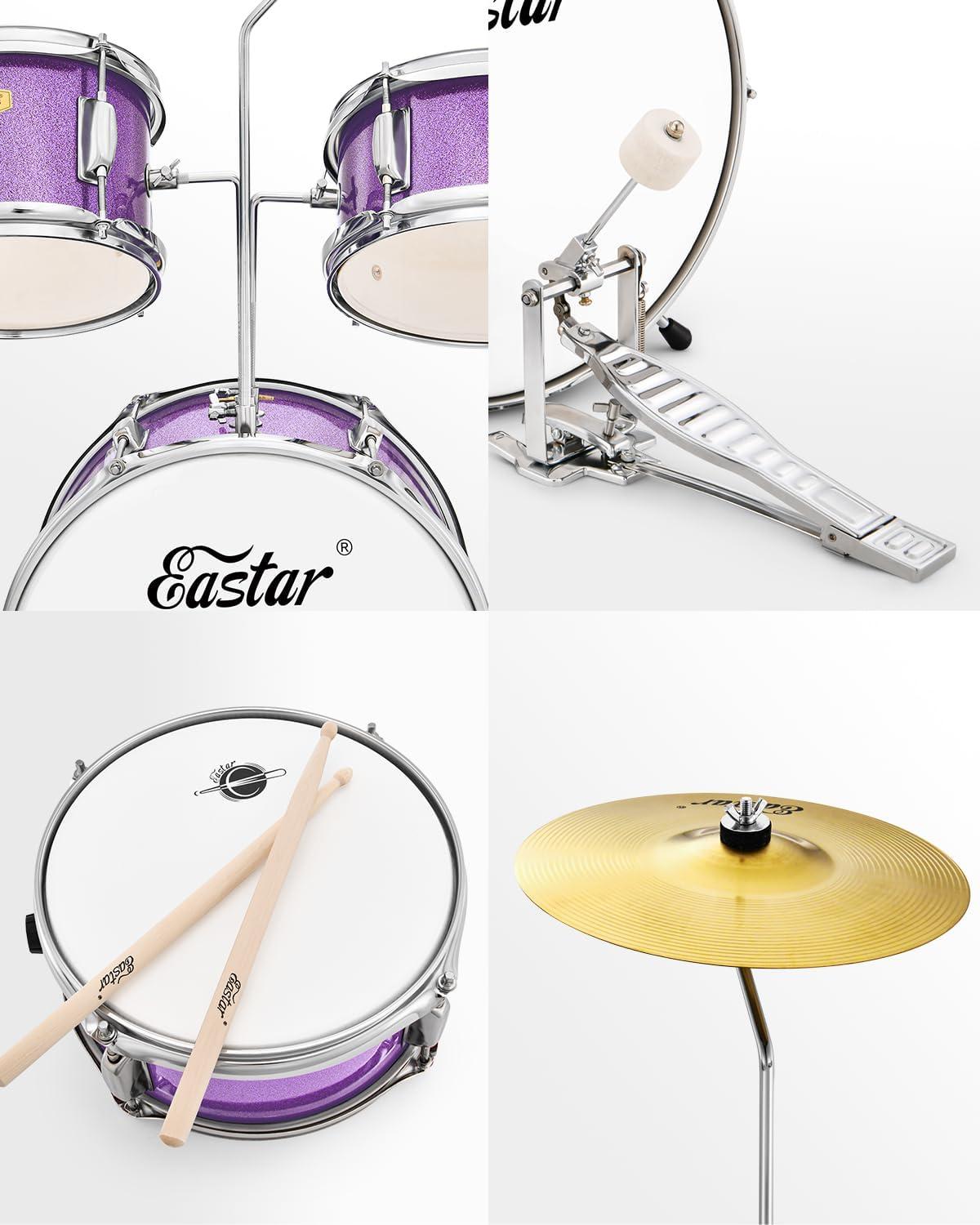 KIDS DRUM KIT: Eastar 3-piece drum set is perfect as beginners in learning and practicing drum, including a 14″ x 10″ Bass drum, a 8″ x 6″ mounted tom drum, a 10″ x 5″ mounted snare drum with internal adjustable soundbelt, and a 10″ cymbal with cymbal arm, providing everything required to get a great start for aged 3-6 7-10.