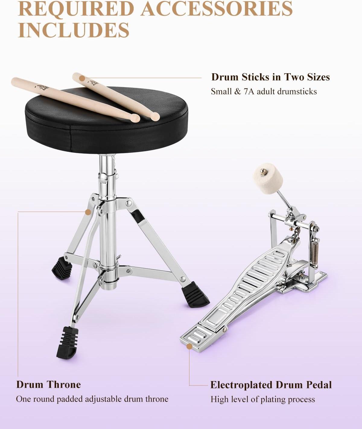 🔷COMPLETE ACCESSORIES : To help kids adapt to learning drum in the early stage, the drums set comes with one plating bass drum pedal. Besides, it also includes a round padded adjustable drum throne, a pair of kids wooden drumsticks and a pair of 7A adults wooden drumsticks, convenient for parents, teachers, elders and children to interact together.